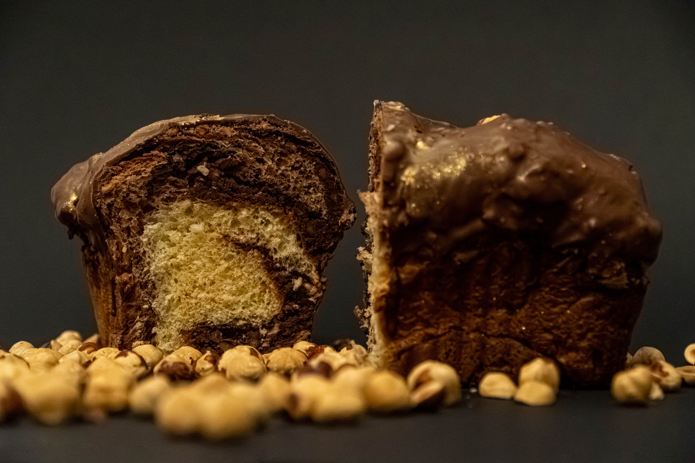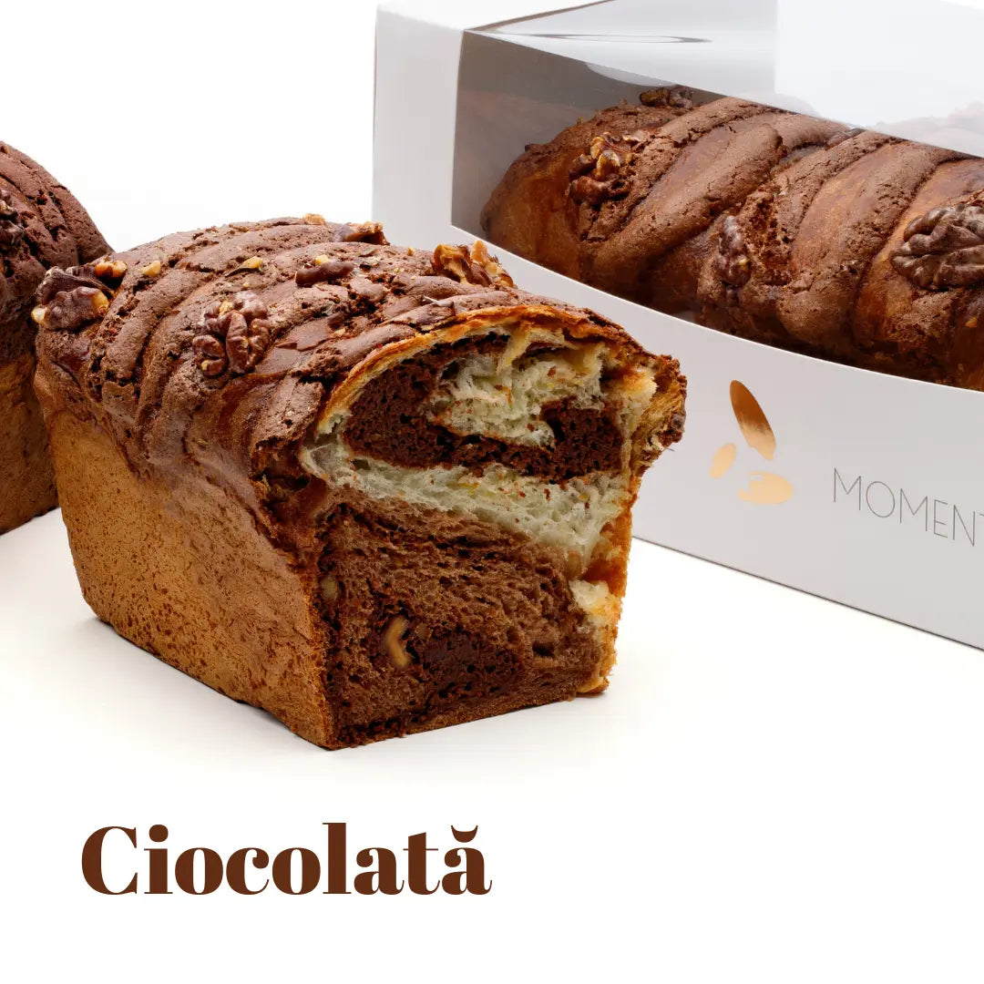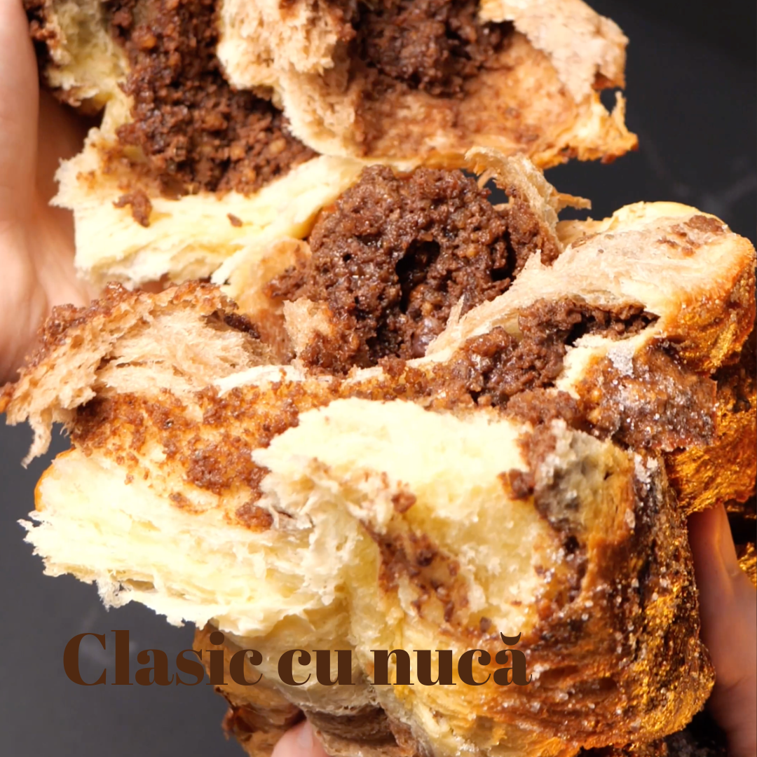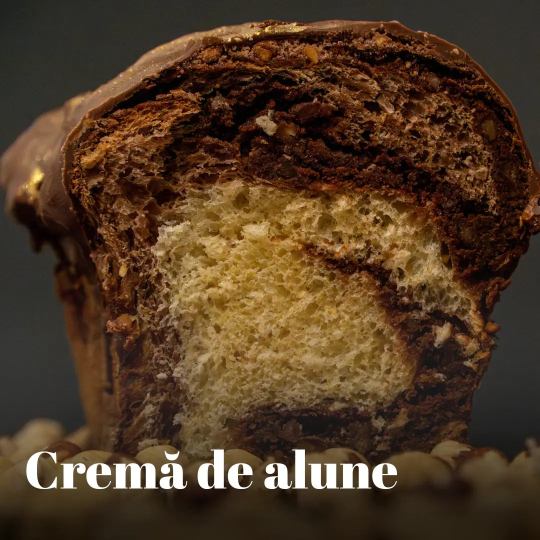 Aluat dospit lent, cu structură aerată și aromă de unt, umplut în dublu strat cu cremă de vanilie naturală și pastă de alune prăjite. Glazura de ciocolată adaugă densitate și un contrapunct amărui. Rezultatul este un cozonac cu profil rotund: dulce, ușor prăjit, echilibrat și stabil aromatic.