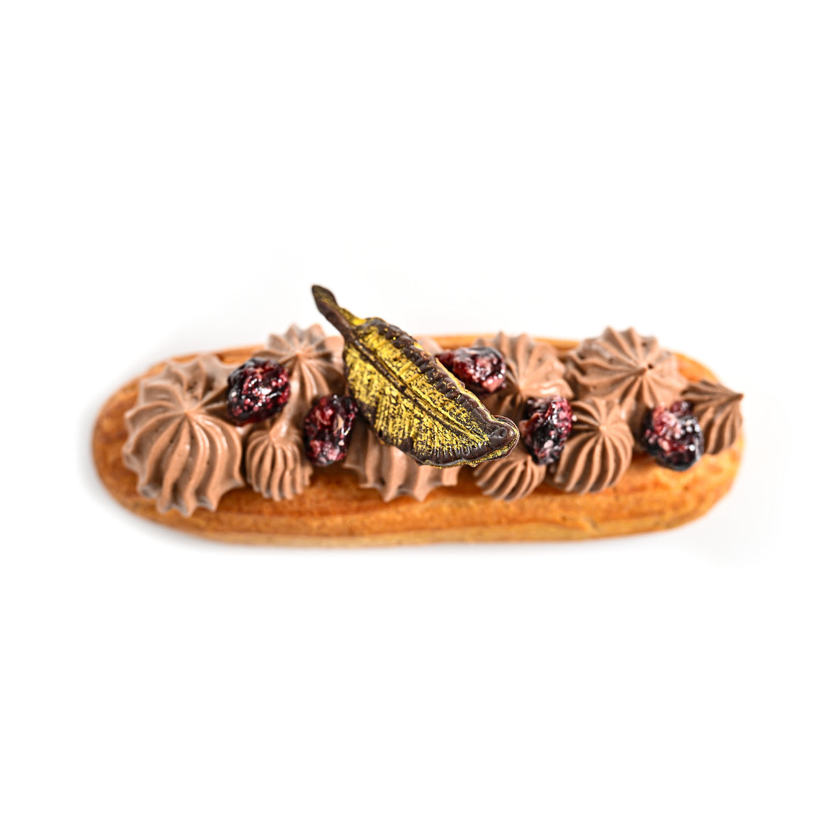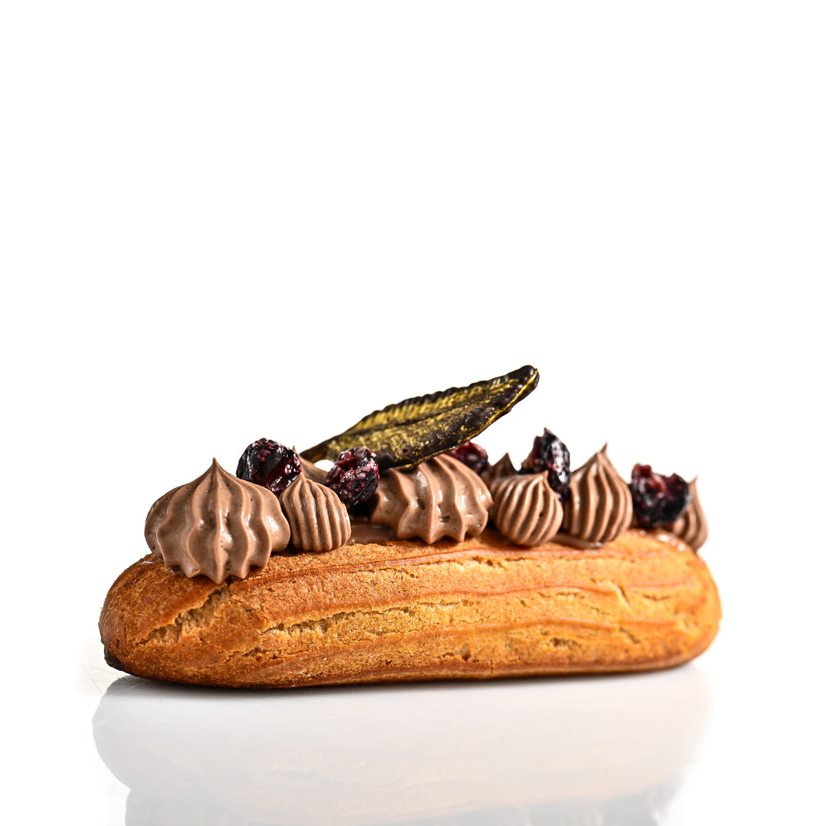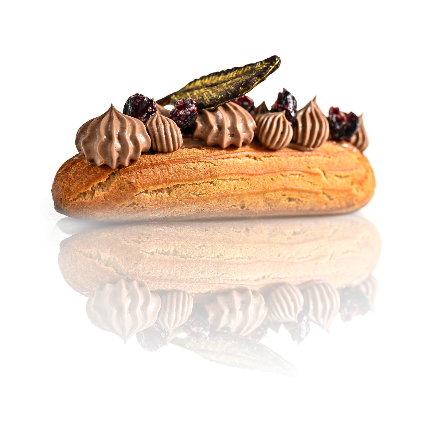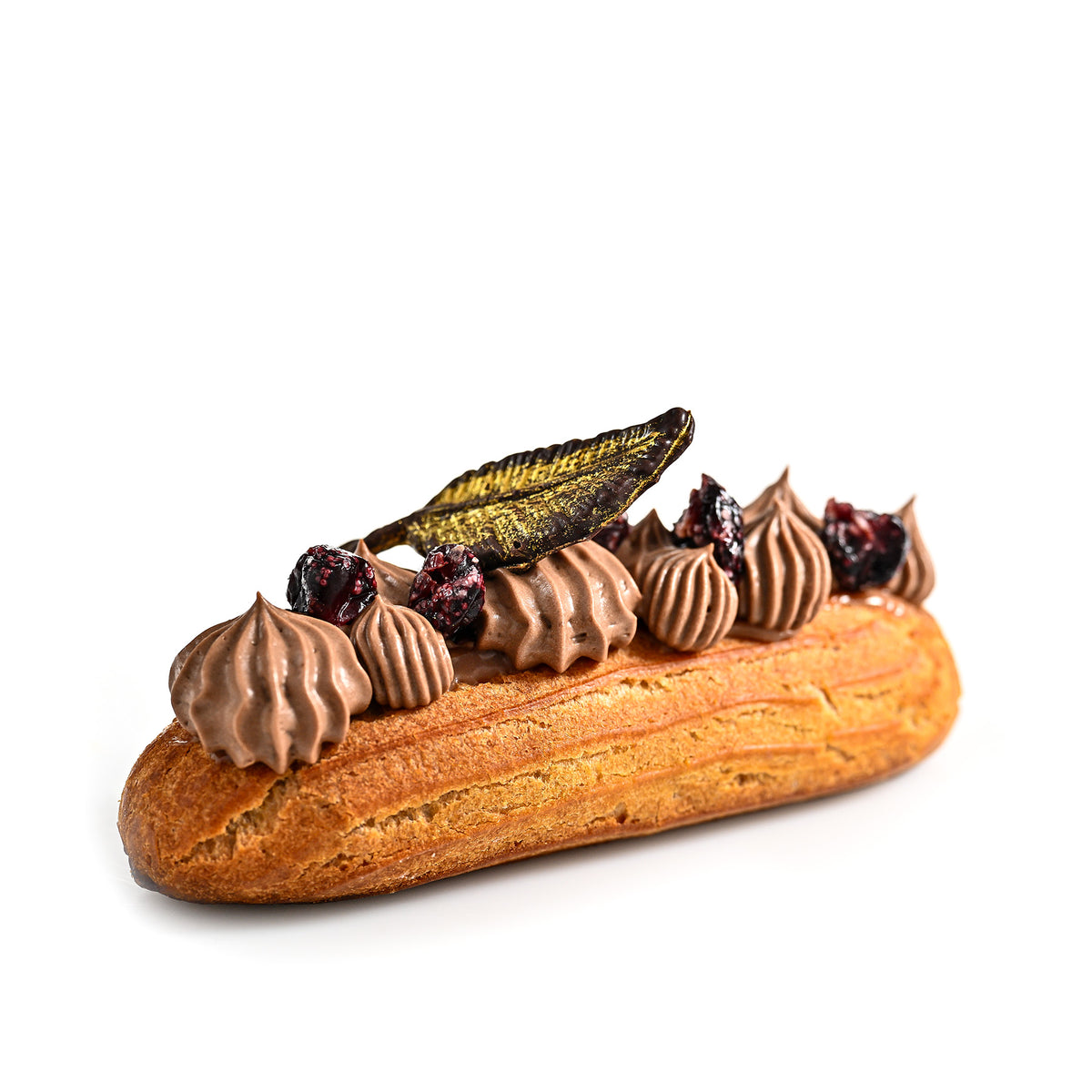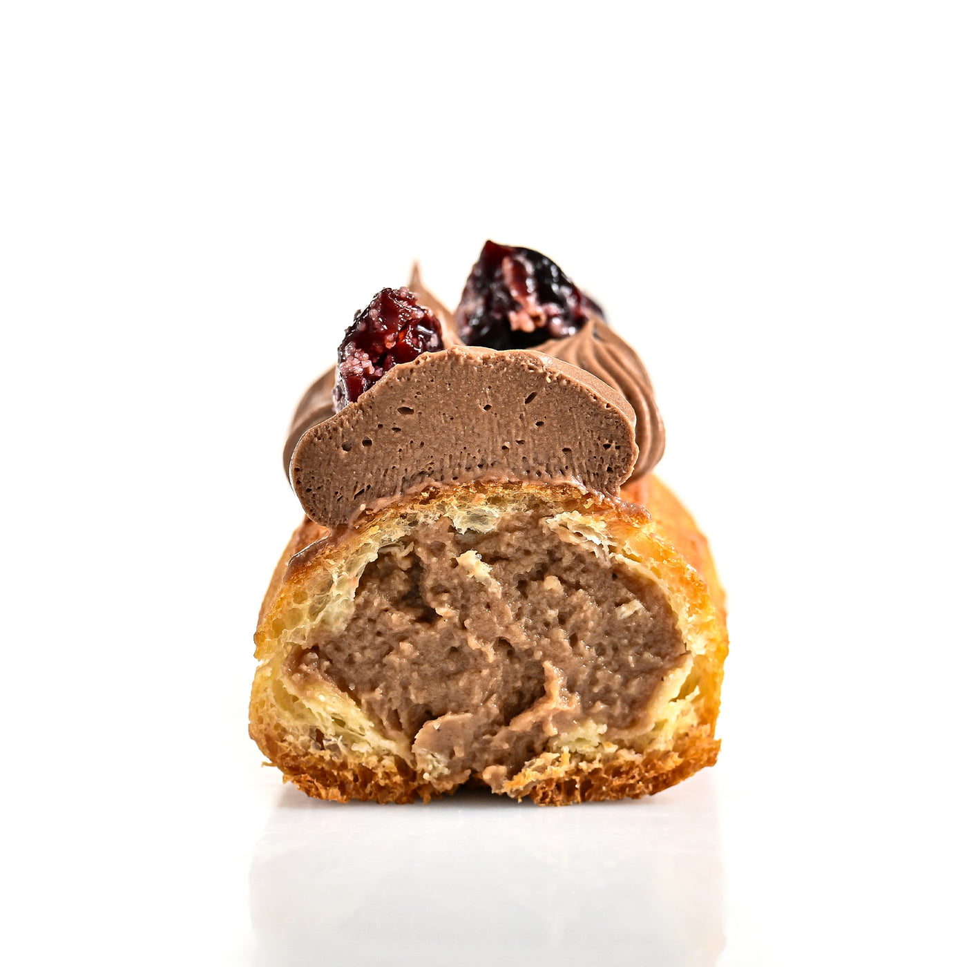 Blat de ecler, chantilly de ciocolată, cremă de vanilie și vișine.