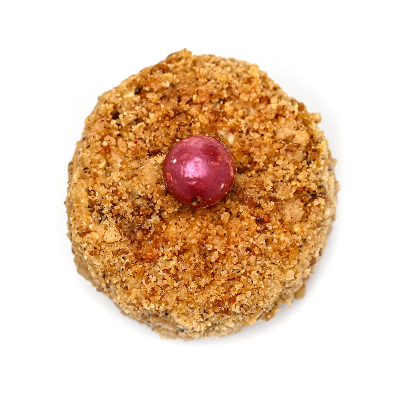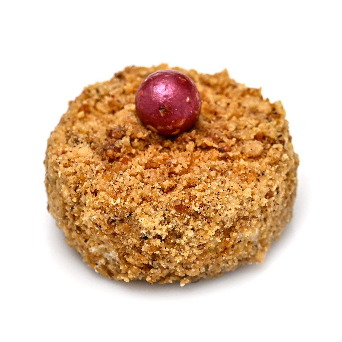 Un joc de contrast și echilibru, construit în jurul unor arome bogate, dar temperate cu grijă. Mousse-ul de mango aduce o prospețime solară, completată de jeleul intens de mure, în timp ce cremoso-ul de praline și stratul de migdale conferă adâncime gustativă. Blatul lejer și glazura lucioasă încheie compoziția într-o armonie vizuală și aromatică, subtilă și sofisticată.
