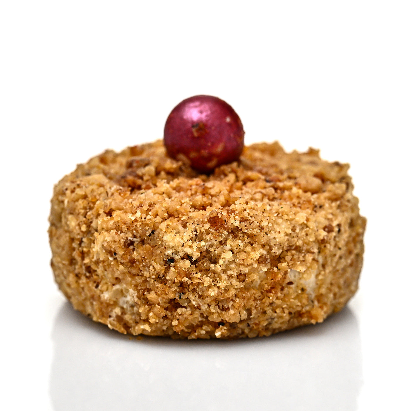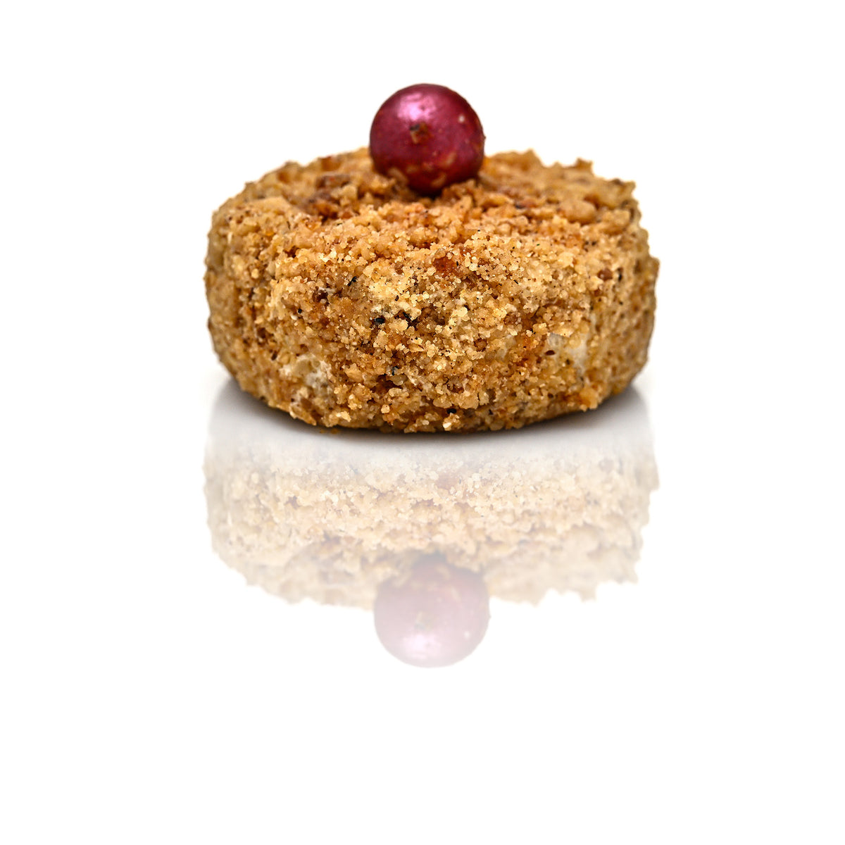 Inspirată de prospețimea zilelor senine, această creație aduce împreună mousse de flori de soc, namelaka de mure și gelatină de căpșuni, într-un dialog delicat între fruct și floare. Blatul umed cu fistic și stratul crocant completează cu texturi echilibrate o compoziție în care eleganța se exprimă prin naturalețe.
