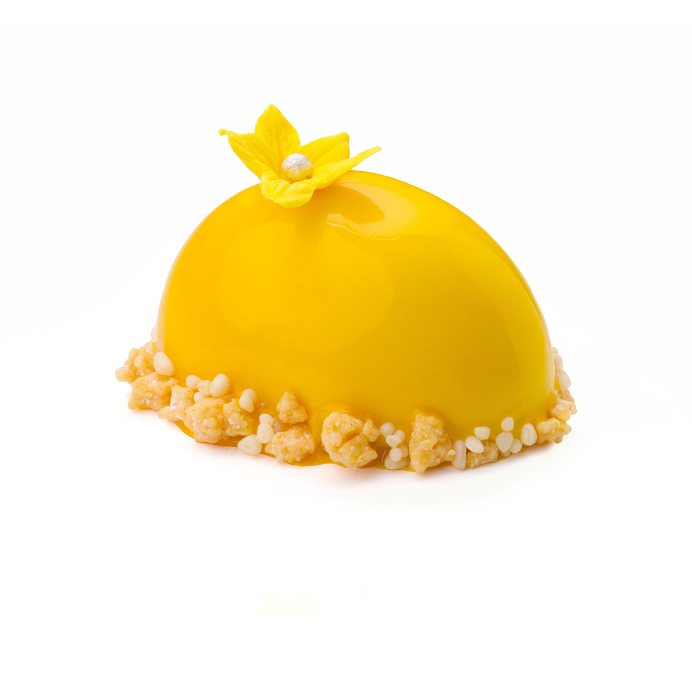 Un joc de contrast și echilibru, construit în jurul unor arome bogate, dar temperate cu grijă. Mousse-ul de mango aduce o prospețime solară, completată de jeleul intens de mure, în timp ce cremoso-ul de praline și stratul de migdale conferă adâncime gustativă. Blatul lejer și glazura lucioasă încheie compoziția într-o armonie vizuală și aromatică, subtilă și sofisticată.