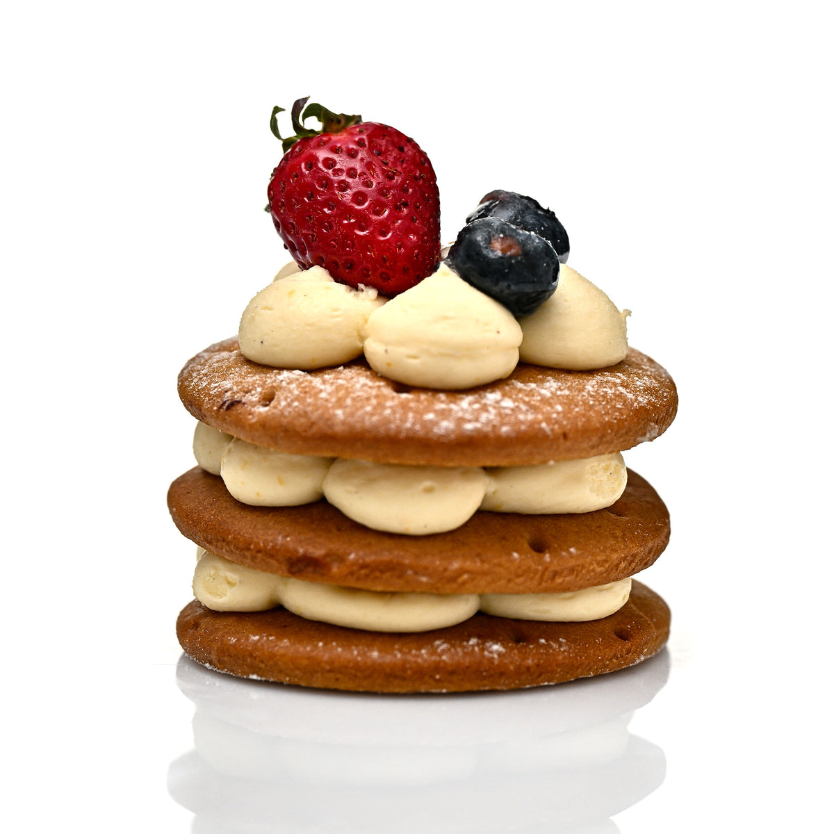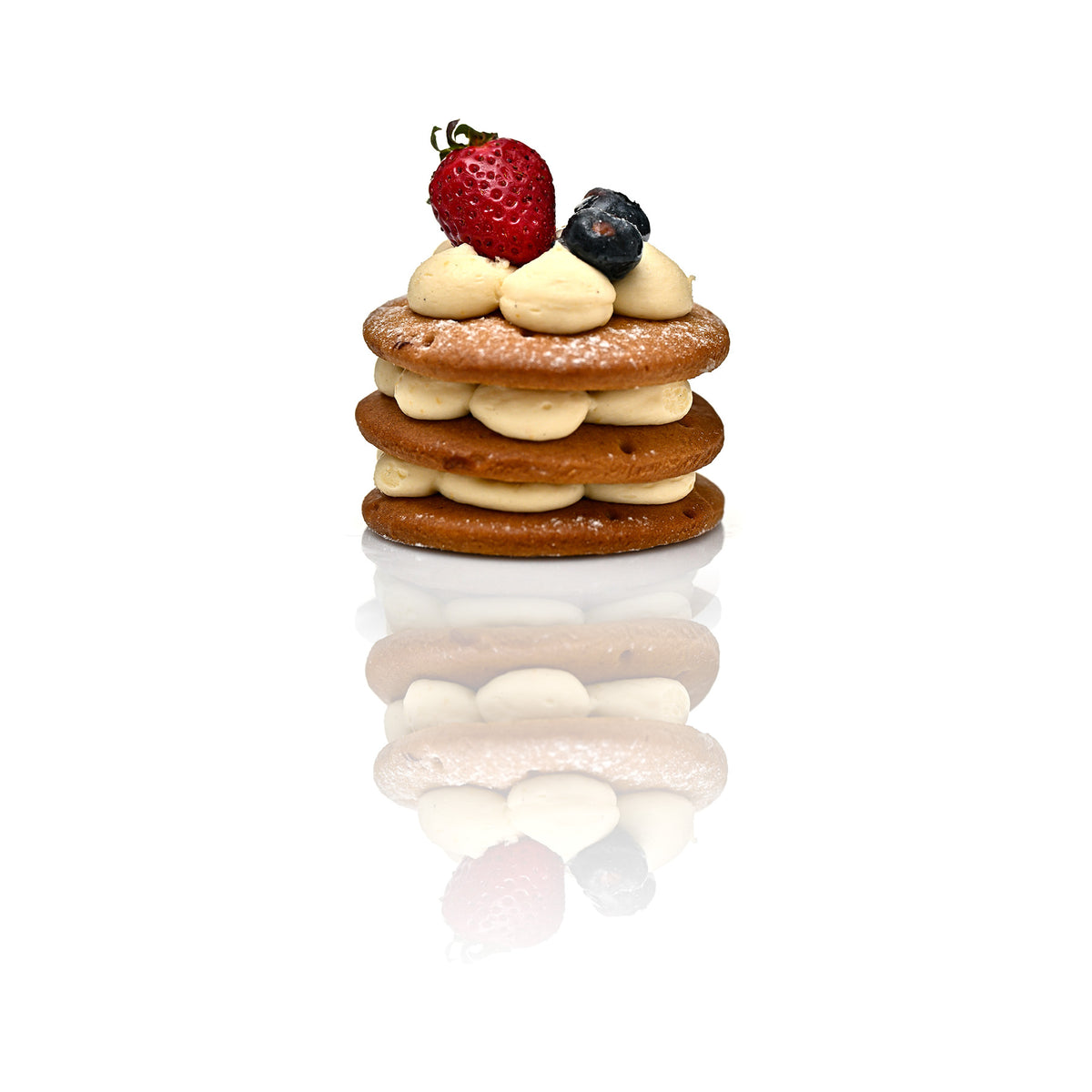 Inspirată de prospețimea zilelor senine, această creație aduce împreună mousse de flori de soc, namelaka de mure și gelatină de căpșuni, într-un dialog delicat între fruct și floare. Blatul umed cu fistic și stratul crocant completează cu texturi echilibrate o compoziție în care eleganța se exprimă prin naturalețe.