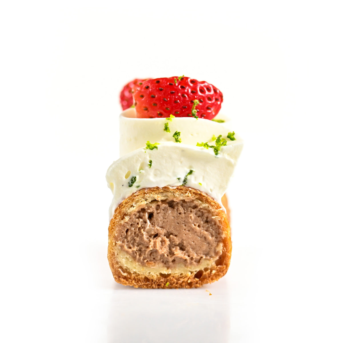 O compoziție cu alură modernă, care îmbină cu grație savoarea caramelului sărat cu texturi contrastante. Crema mousseline este echilibrată de o glazură fină și accente crocante de popcorn caramelizat, într-un joc atent calibrat între familiar și sofisticat.